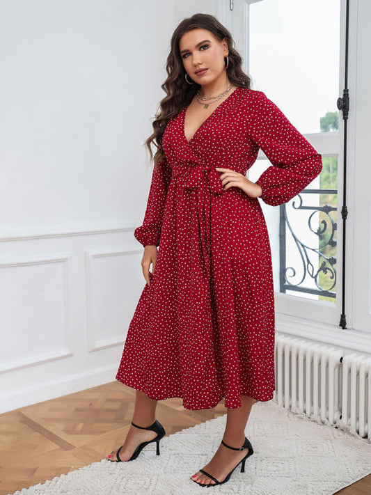 Women's Plus Size Dot Print Puff Sleeve Tie Waist V Neck Wrap Midi Dress
