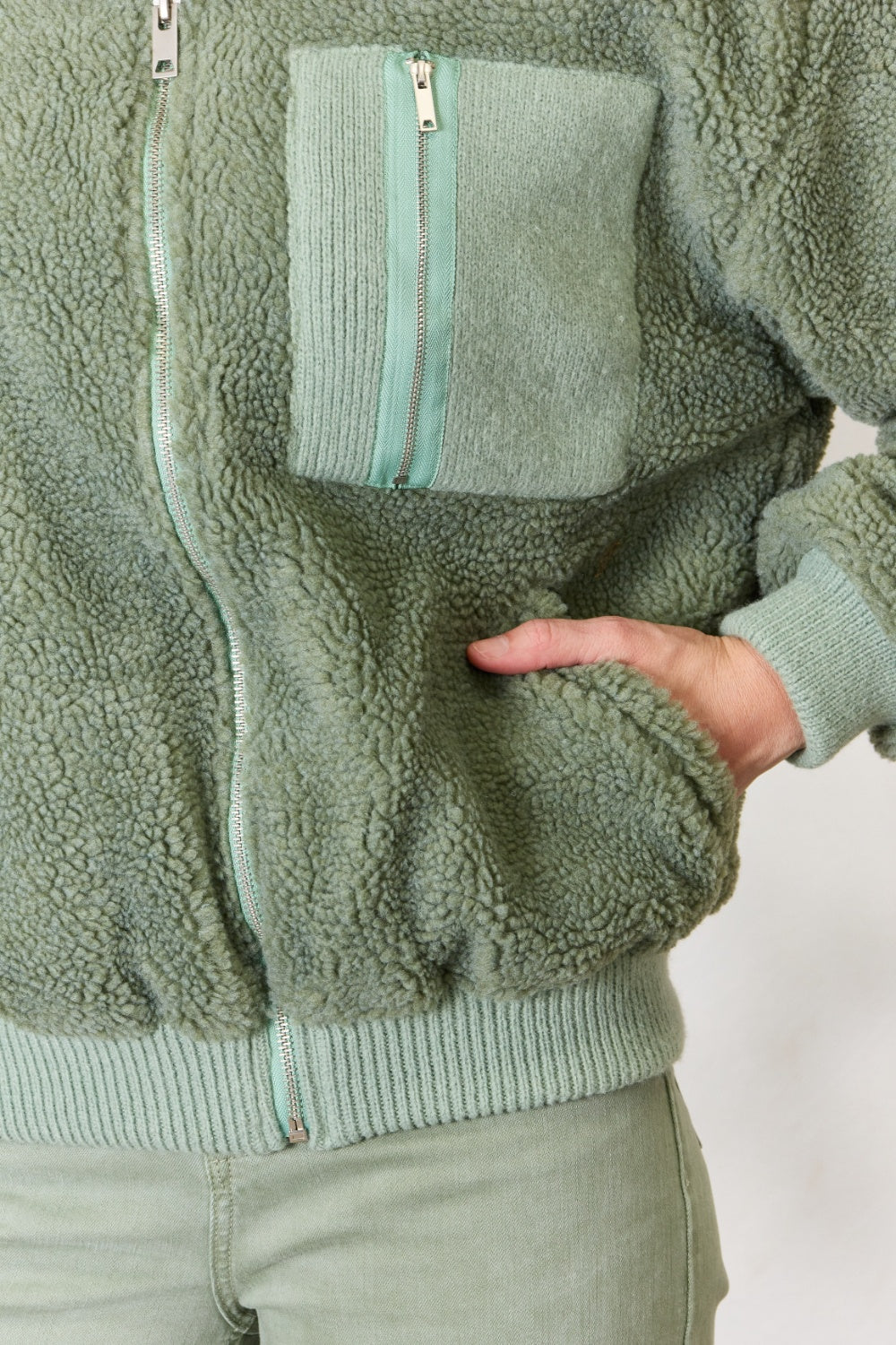 This cozy and chic jacket is a must-have for the colder months, featuring a soft and luxurious sherpa fabric that will keep you warm and stylish. The front zipper closure provides easy wear, while the collar adds an extra layer of warmth and sophistication.